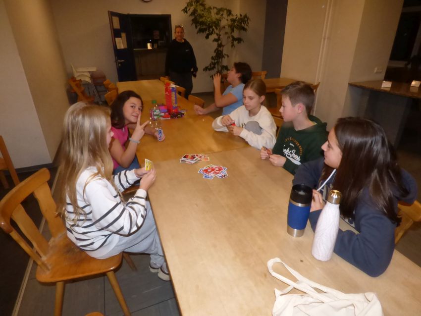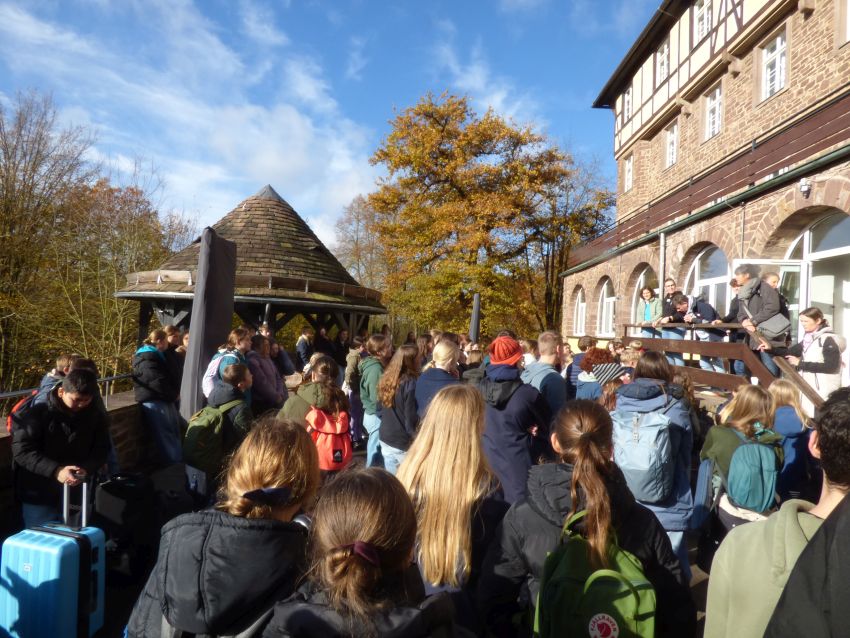 Die Jugendherberge Helmarshausen nahm die Einsteiner herzlich auf und verwöhnte alle mit köstlichem Essen, schönen Zimmern und einem tollen Außengelände. Während des Tages ertönten aus allen Probenräumen wohlklingende Klänge, Klein und Groß machten gemeinsam tolle Musik, unterstützen sich in allen Lebenslagen und hatten viel Spaß. Am Donnerstag begann der letzte Abend mit einem Wanderkonzert in allen Probenräumen, wo die Musizierenden ihre Arbeit stolz präsentierten. Anschließend wurde in der Mehrzweckhalle unter schummrigen Discolicht ausgiebig gefeiert mit einstudierten Tänzen und dem ungeduldig erwarteten, traditionellen Lehrersong: "Völlig losgelöst von der Schule probt das AEG gnadenlos, pausenlos, hemmungslos, grandios....." Herr Knedeisen, der seit Sommer die Fachgruppe verstärkt, brillierte hier mit einem starken Gitarrensolo.