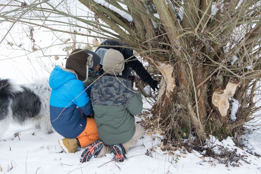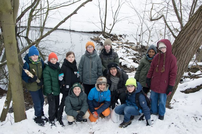 Mitten in den Zeugnisferien brach eine kleine Gruppe der Garten-Kids mit ihren Eltern zu einer nicht alltäglichen Exkursion auf: Es ging mitten hinein in eines der aktuell verschneiten Biberreviere im Weserbergland, wohin der pelzige und nahezu ausgerottete Landschaftsgestalter seit 2020 zurückgekehrt ist. Biberberaterin Michaela Meyer führte die aufgeweckte Gruppe einmal um den See und zeigte die Spuren, durch die sich Europas größtes Nagetier eindeutig verrät: Fraß- und Nagespuren, Ein-und Ausstiege samt Biberrutschen, Fußspuren, seinen als Burg bezeichneten Bau und seinen Staudamm, durch den er den Wasserstand so reguliert, dass der Eingang in seinen Bau stets unter Wasser liegt, sodass die Tiere vor Fressfeinden geschützt sind. Während des rund zweistündigen Spaziergangs haben die Schülerinnen und Schüler der Garten-AG mit eigenen Augen sehen und erleben können, was die meisten, wenn überhaupt, nur aus Büchern oder Filmen kennenlernen - ein echtes Biberrevier direkt vor der Haustür.