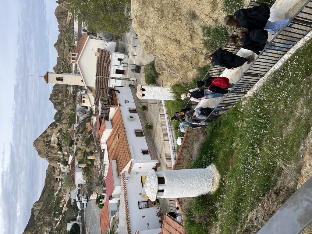 Nachdem es heute Morgen genieselt hat und wir uns beinahe heimelig gefühlt haben, konnten wir vormittags bereits bei bedecktem Himmel und 18 Grad die traditionellen andalusischen Höhlenhäuser bewundern. Bis heute leben in Guadix Personen in diesen Häusern, die ein wenig wie Frodos Dorf aus dem Auenland wirken: Rundliche, weiße Schornsteine und Lichtschächte ragen aus grünen Wiesen, die eigentlich die Dächer der Häuser sind. Diese Höhlenhäuser haben ganzjährig ein Innenklima von 20 Grad, also sind sie im Winter warm (was Heizkosten spart) und im Sommer kühl, was die Klimaanlage spart. Insbesondere im Sommer möchten die Bewohner bei über 40 Grad im Schatten natürlich sehr gerne bei 20 Grad schlafen! Durch das besondere Klima hält der Lehmboden die Höhlenbauten über Jahre stabil und sicher, sodass moderne Häuser entstanden sind und bis heute eine günstige Art zu leben darstellen.
