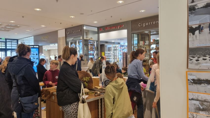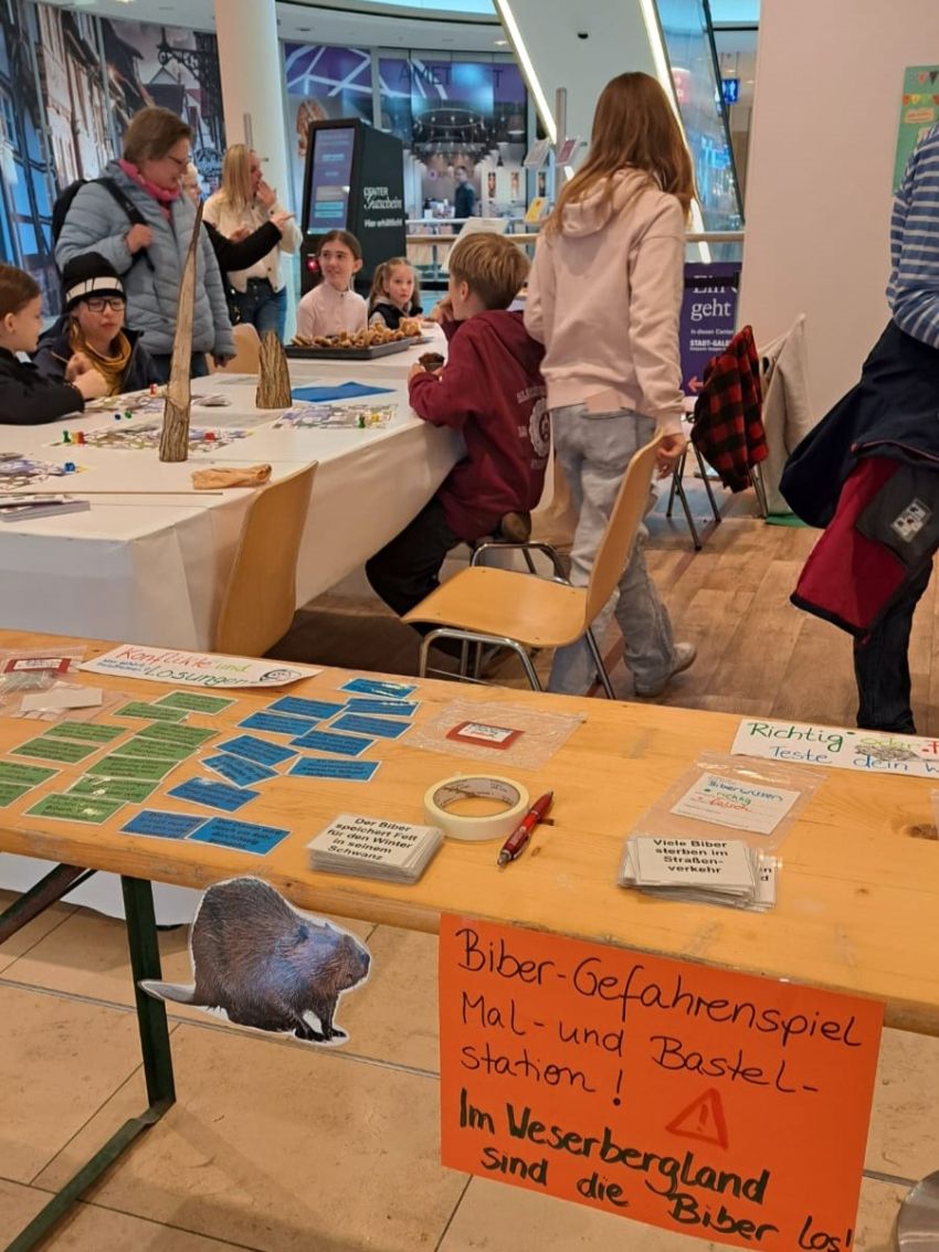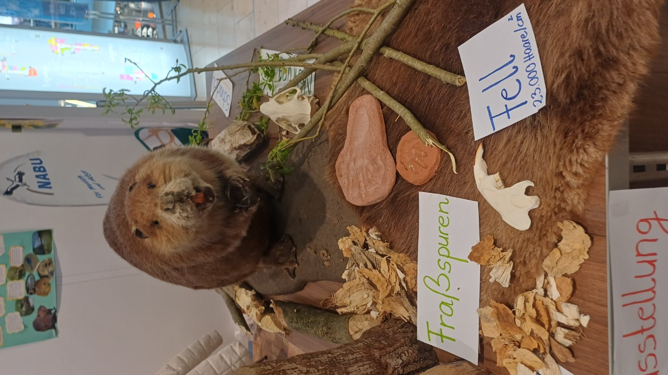 Im Weserbergland sind die Biber los: Das war das Motto des am 11.4. in der Stadt-Galerie von unserer Garten-AG durchgeführten Biberaktionstags, um für mehr Akzeptanz für den pelzigen Landschaftsgestalter in der Hamelner Bevölkerung zu werben. Unterstützt wurden die Gartenkids von Michaela Meyer und Ralf Schulte von der Biber AG des Nabus. Highlight des Tages war allerdings unser Albert, ein ausgestopfter Biber, den Familie Gattermann extra aus Burgdorf eingeflogen hatte und der die Hauptattraktion der kleinen Biberausstellung mit Fraßspuren, Schädel, Kot, Fell, Pfotenabdrücken und Nahrung darstellte. Des Weiteren gab es selbstgestaltete Infotafeln, das Bibergefahrenspiel "Ein Biber beißt sich druch", Kartenspiele wie Teste dein Wissen "Richtig oder Falsch" oder "Konflikte und Lösungen", Biberbalsteln, Ausmalbilder und das Biberrevier im Schuhkarton. Im hinteren Bereich der Stadt-Galerie konnten die Besucher nach einer Präsentation des kurzweiligen Films "Einstein-Faktencheck" Einsteins-Biberquiz im Format von 1,2 oder 3 spielen und so ihr Wissen rund um den Ökosystemingenieur erneut zeigen. Für jede richtige Antwort gab es eine Erbse in einen kleinen Blumentopf.