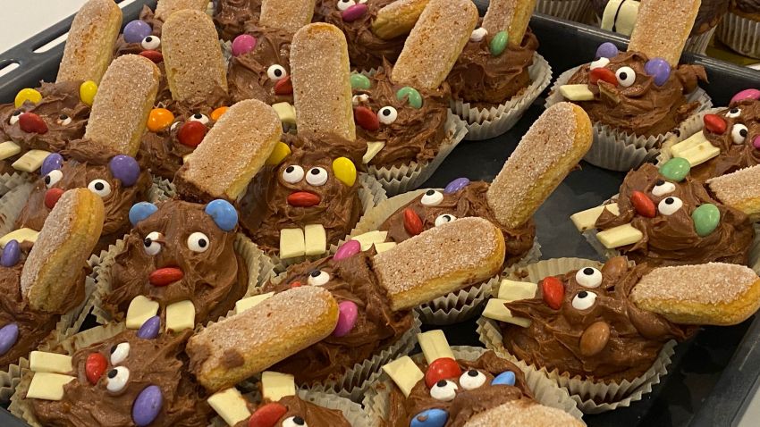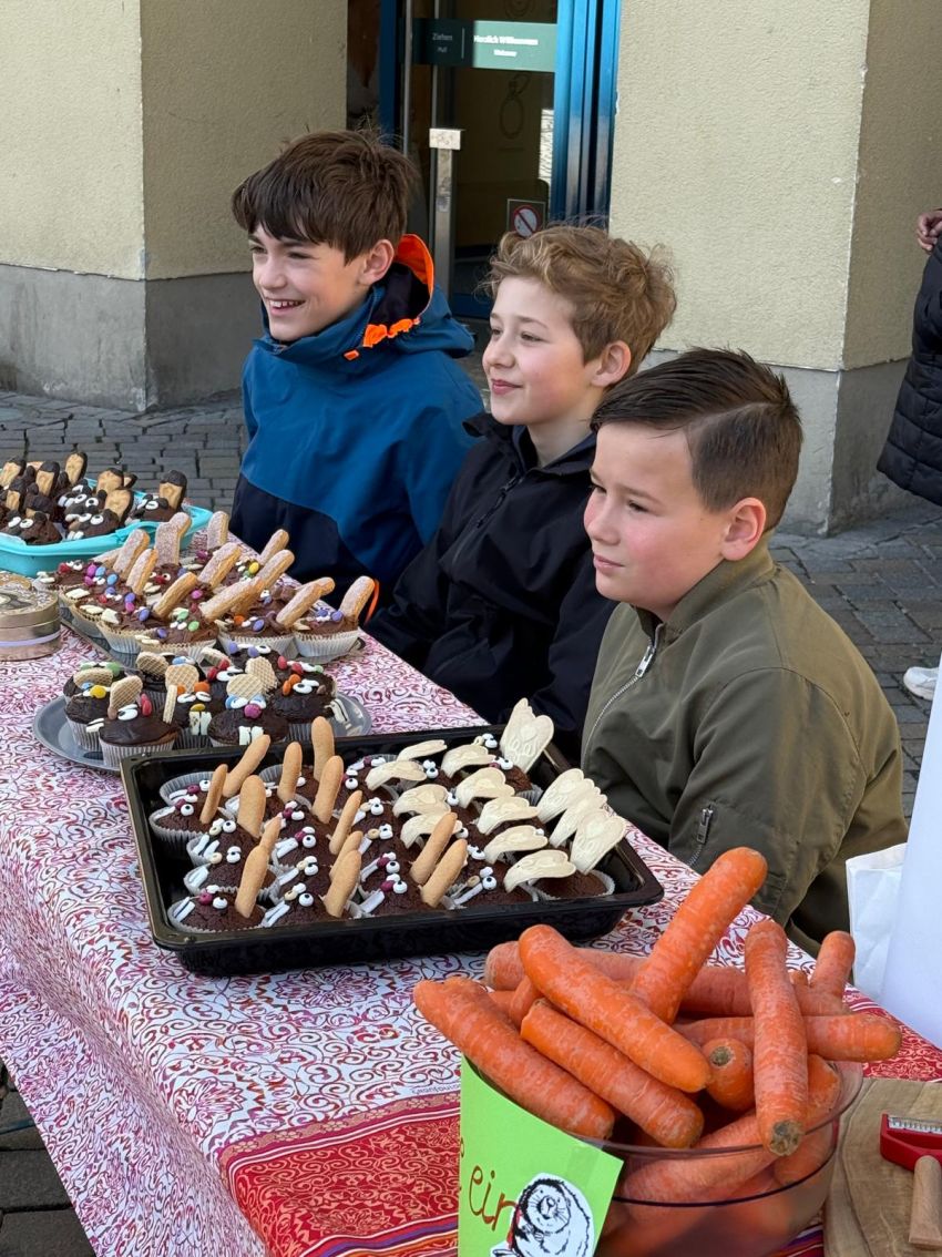 Vor der Stadt-Galerie gab es noch einen Stand mit leckeren Bibermuffins, die die Gartenkids und ihre Mütter mit viel Liebe und Geschick gebacken hatten und die Station "Nage wie ein Biber". Hier ging es darum, in eine Möhre die typische Sanduhform eines vom Biber gefällten Baumes zu nagen.