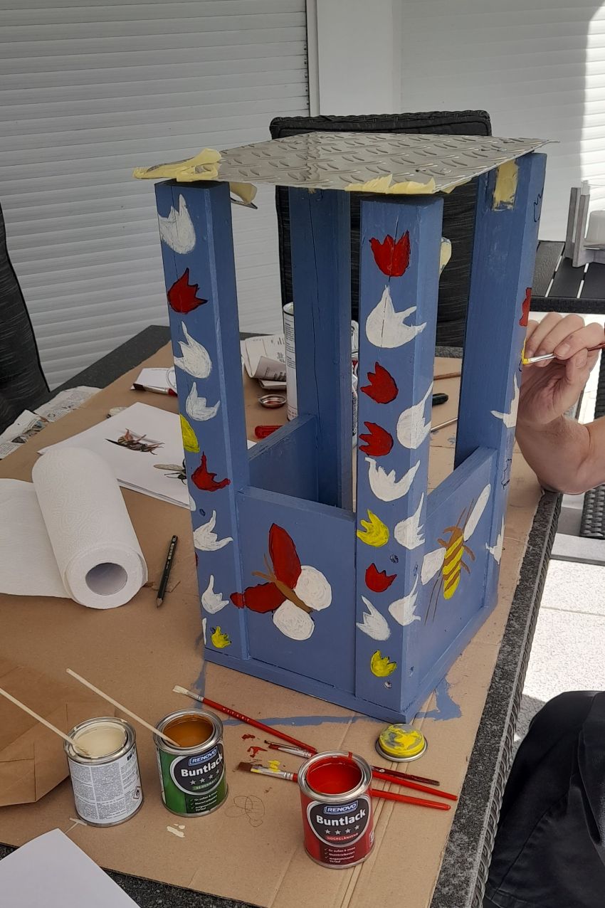 Anfang Mai kam das Paket mit dem Automaten und dem ersten Saatgut aus Bremen in der Rattenfängerstadt an, in den Sommerferien wurde die Halterung kunstvoll mit Unterstützung von Herrn Schwandt bemalt und nun ist unser Automat endlich befüllt. Jetzt müssen wir noch einen Pfosten und eine Einschlaghülse besorgen und v.a. einen geeigneten Standort auswählen, denn wir wollen, dass der Automat lange unbeschadet steht und v.a. auch genutzt wird. Die leeren Kapseln sollen nach Aussaat der Blumensamen in das kleine Vogelhäuschen zurückgegeben werden, sodass die Garten-Kids diese wieder mit Saatgut aus Alberts Garten befüllen können. Das eingenommene Geld wird dann für Kinder oder die Umwelt gespendet werden. Vielleicht habt ihr gute Ideen, wo wir unseren Automaten aufstellen könnten. Schreibt eure Ideen gern an