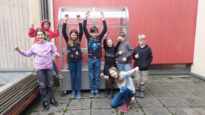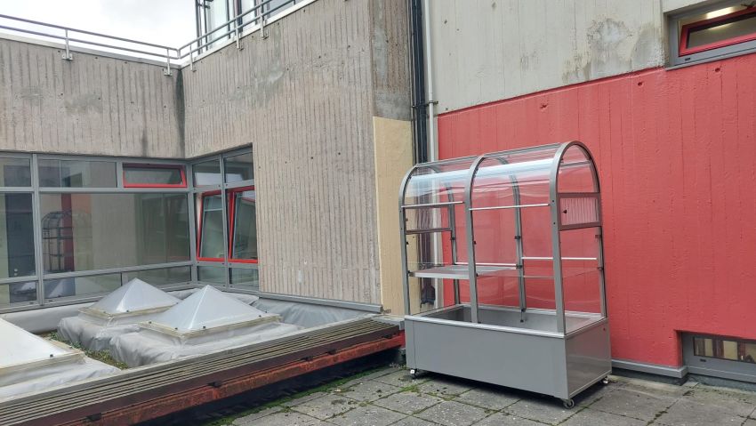 Seit gut einer Woche besitzt die Schulgarten-AG ein Balkongewächshaus zur Voranzucht von Gemüsepflanzen für den Schulacker. Ein großer Dank geht an die Firma Hoklartherm und Frau Martens, die für uns die ganze Organisation und Abwicklung gemanagt hat. Einen Teil hat die Garten-AG dazu aus Wettbewerbsgewinnen finanziert und einen Teil hat uns die Firma Hoklartherm gespendet! Es war bedurfte geistiger Anstrengung und viel Kraft, um das gute Stück bis zum Lichthof im ersten Stock zu manövrieren, denn nicht nur der Fahrstuhl erwies sich als zu klein, sondern auch zahlreiche Türen hatten nicht die erforderliche Höhe und stellten zunächst ein unüberwindbares Hindernis dar. Schließlich ging es über den hinteren Schulhof, über die Treppe am Lehrerparkplatz und weiter in Schräglage durch die Flure und Türen im 1. Stockwerk. Nun können wir unsere Gemüsepflanzen bis zu den Eisheiligen geschützt im Hof oben vorziehen, bis sie dann Ende Mai ihren endgültigen Standort im Schulgarten im Acker finden. Ein großer Dank geht auch an die Jungs aus Jahrgang 10 und 11, die so tatkräftig mit angepackt haben. Ohne EUCH hätte das nicht so gut geklappt!