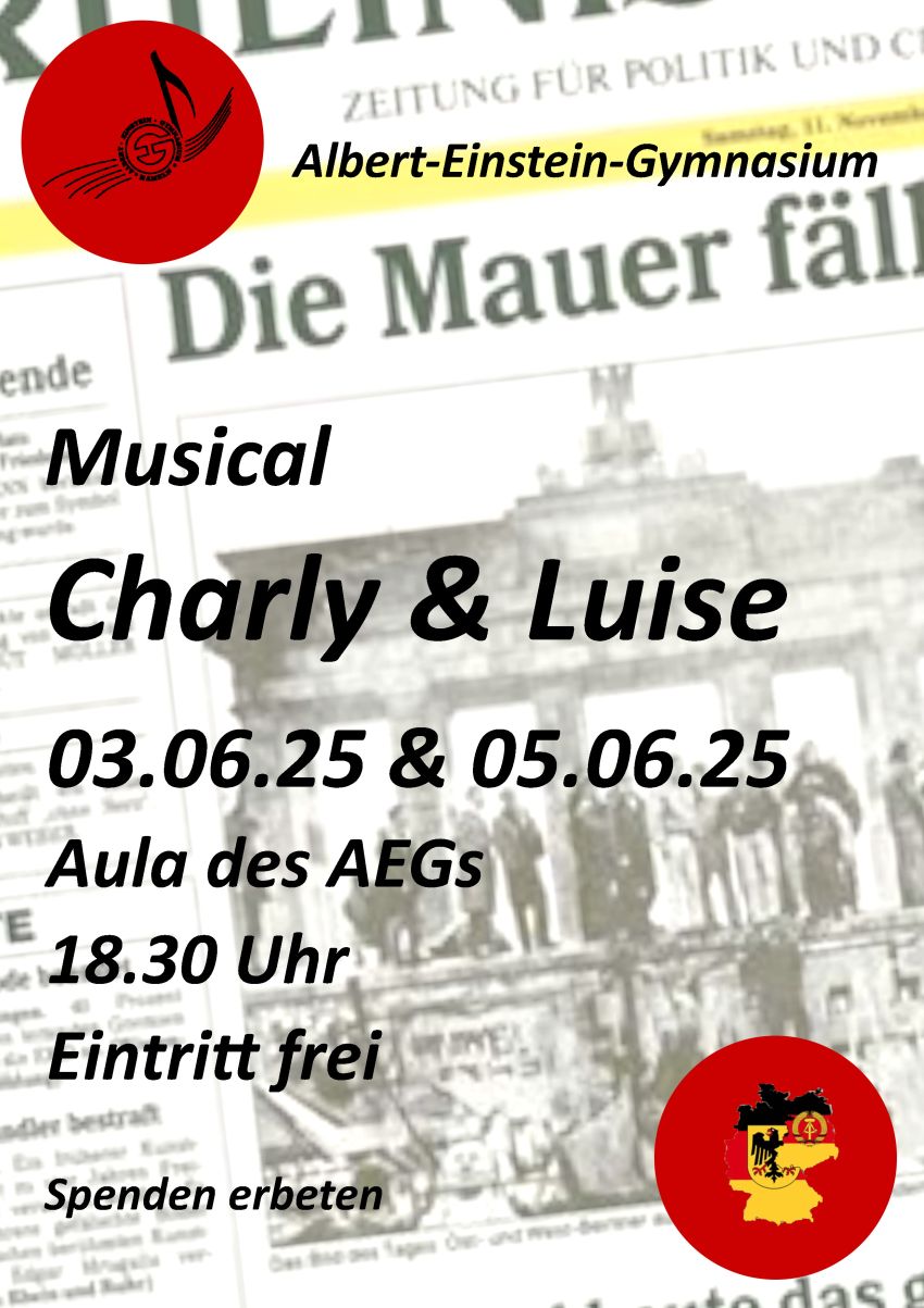 Als Luise ihren Papa fragt, „Was ist das eigentlich, die DDR?“ ahnt sie noch nicht, dass sie eine Zwillingsschwester hat, die in Ostberlin aufgewachsen ist, während sie selbst in Westberlin groß geworden ist. Als sie ihrer Schwester Charly dann zufällig bei einem internationalen Sportwettkampf über den Weg läuft, passiert es: Charly und Luise werden verwechselt und tauschen gezwungenermaßen die Rollen und auch ihr Heimatland... Sie lernen in der neuen Schule die Weltanschauung des anderen politischen Systems kennen und müssen erfahren, dass die Menschen in beiden Teilen Deutschlands wenig über den jeweils anderen Teil des Landes wissen. Wenn ihr wissen wollt, wie es ausgeht mit den beiden Zwillingen und warum am Ende nicht nur Udo Lindenberg und die Scorpions, sondern auch noch ein etwas in Jahre gekommener US-Serienstar auftreten, dann kommt am 3.6.25 oder am 5.6.25 um 18.30 Uhr zur Musical-Aufführung in die AEG-Aula. Der Eintritt ist frei, über Spenden freut sich die Musikfachgruppe aber natürlich sehr!