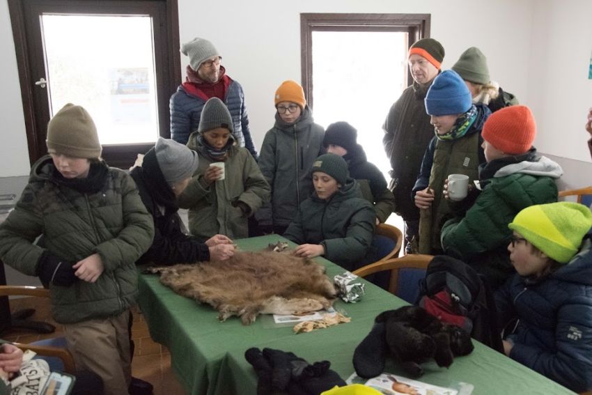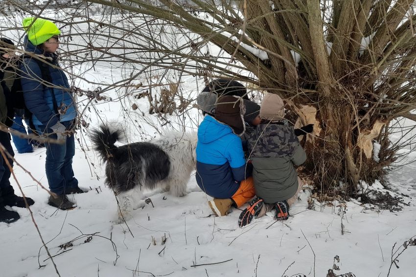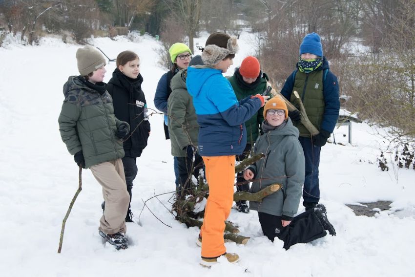 Mitten in den Zeugnisferien brach eine kleine Gruppe der Garten-Kids mit ihren Eltern zu einer nicht alltäglichen Exkursion auf: Es ging mitten hinein in eines der aktuell verschneiten Biberreviere im Weserbergland, wohin der pelzige und nahezu ausgerottete Landschaftsgestalter seit 2020 zurückgekehrt ist. Biberberaterin Michaela Meyer führte die aufgeweckte Gruppe einmal um den See und zeigte die Spuren, durch die sich Europas größtes Nagetier eindeutig verrät: Fraß- und Nagespuren, Ein-und Ausstiege samt Biberrutschen, Fußspuren, seinen als Burg bezeichneten Bau und seinen Staudamm, durch den er den Wasserstand so reguliert, dass der Eingang in seinen Bau stets unter Wasser liegt, sodass die Tiere vor Fressfeinden geschützt sind. Während des rund zweistündigen Spaziergangs haben die Schülerinnen und Schüler der Garten-AG mit eigenen Augen sehen und erleben können, was die meisten, wenn überhaupt, nur aus Büchern oder Filmen kennenlernen - ein echtes Biberrevier direkt vor der Haustür.