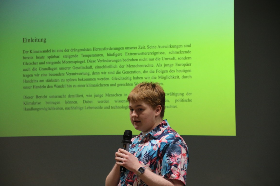 Im Rahmen der Feierstunde hielten auch Linus Sturm und Maya McKay aus dem Jahrgang 13 kurze Grußworte und wiesen auf die Aktivitäten der neu gegründeten Jungen Europäischen Föderalisten (JEF) im Landkreis Hameln-Pyrmont hin.