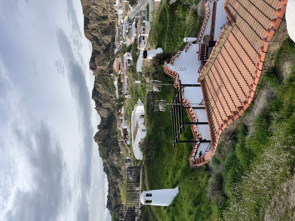 Nachdem es heute Morgen genieselt hat und wir uns beinahe heimelig gefühlt haben, konnten wir vormittags bereits bei bedecktem Himmel und 18 Grad die traditionellen andalusischen Höhlenhäuser bewundern. Bis heute leben in Guadix Personen in diesen Häusern, die ein wenig wie Frodos Dorf aus dem Auenland wirken: Rundliche, weiße Schornsteine und Lichtschächte ragen aus grünen Wiesen, die eigentlich die Dächer der Häuser sind. Diese Höhlenhäuser haben ganzjährig ein Innenklima von 20 Grad, also sind sie im Winter warm (was Heizkosten spart) und im Sommer kühl, was die Klimaanlage spart. Insbesondere im Sommer möchten die Bewohner bei über 40 Grad im Schatten natürlich sehr gerne bei 20 Grad schlafen! Durch das besondere Klima hält der Lehmboden die Höhlenbauten über Jahre stabil und sicher, sodass moderne Häuser entstanden sind und bis heute eine günstige Art zu leben darstellen.