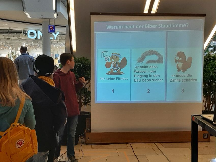 Dieser Tag hat wieder gezeigt, was alles möglich ist, wenn sich engagierte Menschen zusammensetzen und ihre Ideen umsetzen. Wir danken allen großen und kleinen Einsteinern, den Familien und Biberschützern, die dazu beigetragen haben, dass der Biberaktionstag so gut gelungen ist und so viel Spaß gemacht hat. Ein großer Dank geht natürlich auch an das Center-Management der Stadt-Galerie für die Bereitstellung des Mobiliars und der Preise für das Biberquiz.