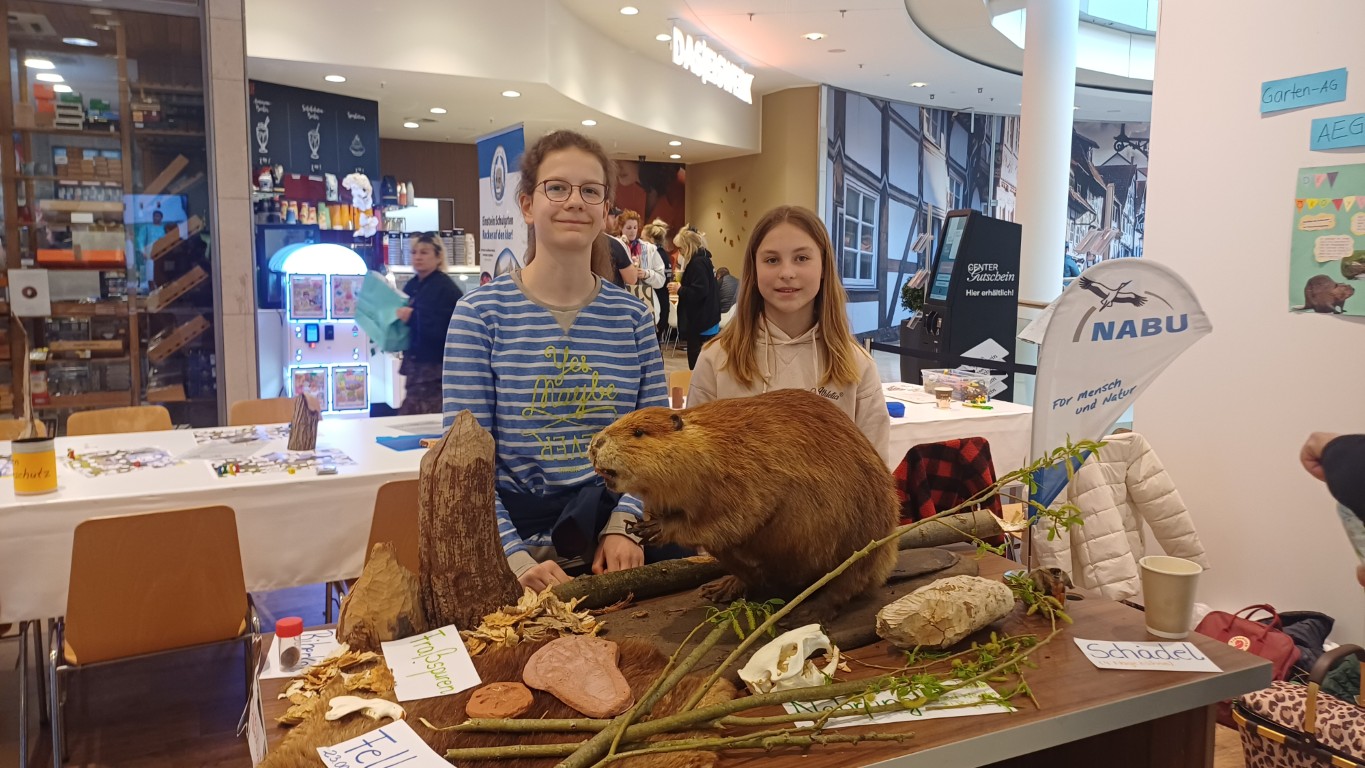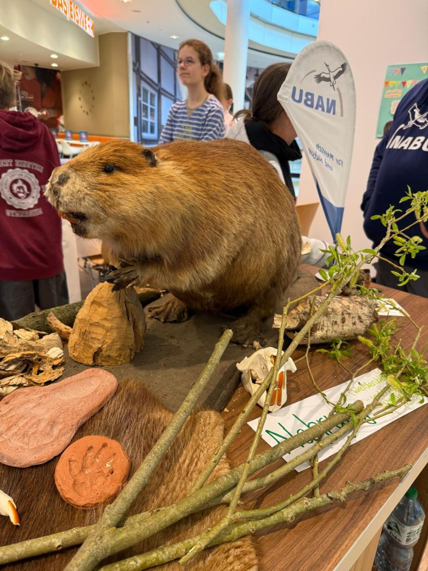 Im Weserbergland sind die Biber los: Das war das Motto des am 11.4. in der Stadt-Galerie von unserer Garten-AG durchgeführten Biberaktionstags, um für mehr Akzeptanz für den pelzigen Landschaftsgestalter in der Hamelner Bevölkerung zu werben. Unterstützt wurden die Gartenkids von Michaela Meyer und Ralf Schulte von der Biber AG des Nabus. Highlight des Tages war allerdings unser Albert, ein ausgestopfter Biber, den Familie Gattermann extra aus Burgdorf eingeflogen hatte und der die Hauptattraktion der kleinen Biberausstellung mit Fraßspuren, Schädel, Kot, Fell, Pfotenabdrücken und Nahrung darstellte. Des Weiteren gab es selbstgestaltete Infotafeln, das Bibergefahrenspiel "Ein Biber beißt sich druch", Kartenspiele wie Teste dein Wissen "Richtig oder Falsch" oder "Konflikte und Lösungen", Biberbalsteln, Ausmalbilder und das Biberrevier im Schuhkarton. Im hinteren Bereich der Stadt-Galerie konnten die Besucher nach einer Präsentation des kurzweiligen Films "Einstein-Faktencheck" Einsteins-Biberquiz im Format von 1,2 oder 3 spielen und so ihr Wissen rund um den Ökosystemingenieur erneut zeigen. Für jede richtige Antwort gab es eine Erbse in einen kleinen Blumentopf.