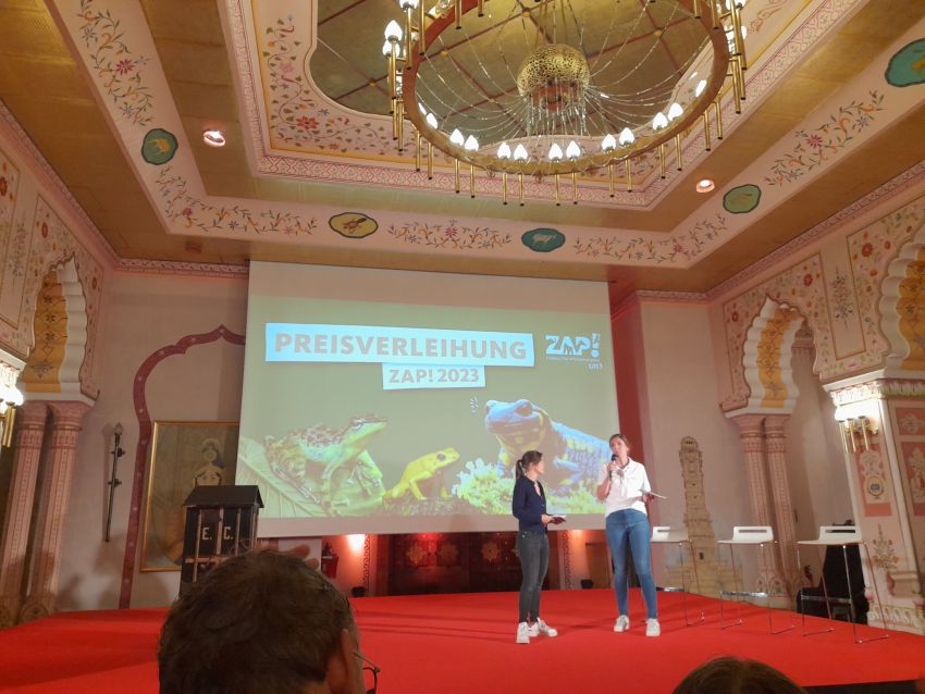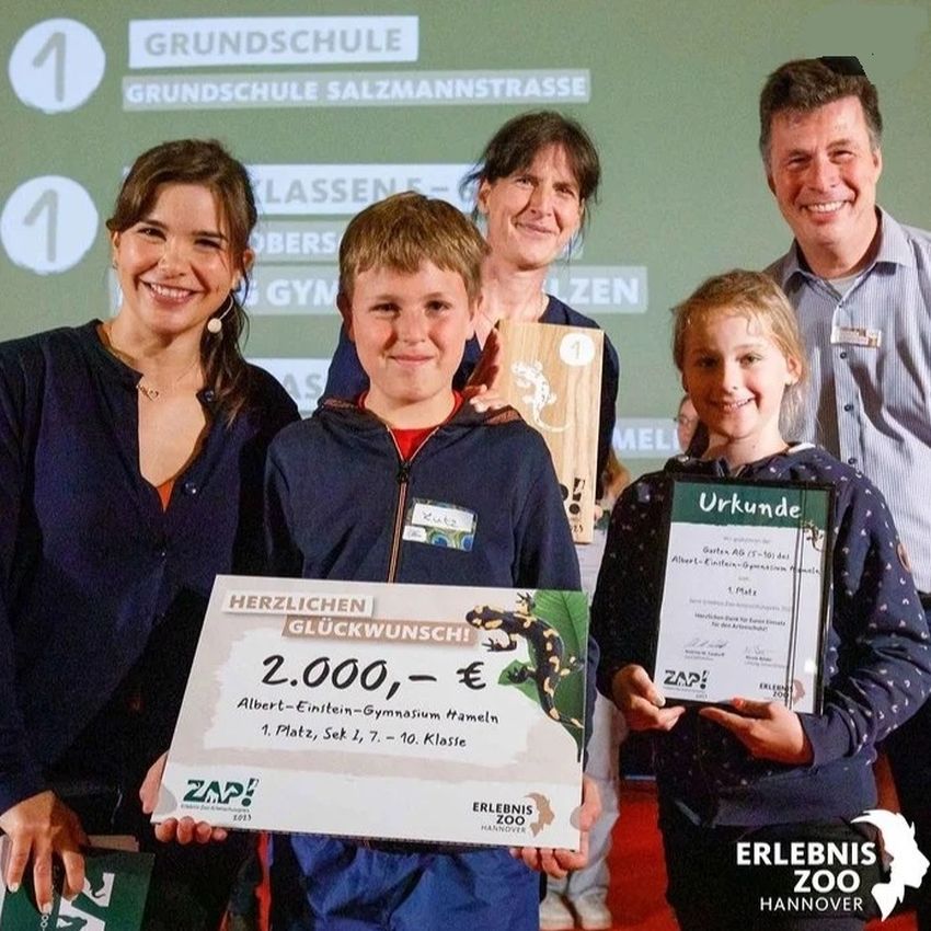 Die kleine Gruppe von Einsteinern hatte von Januar bis Mai die Amphibien im Weserbergland unter die Lupe genommen und die dort vorkommenden Arten und ihre Habitate auf dem Instagramaccount mit selbst geschossenen Fotos präsentiert, ihre Gefährdungsursachen und Schutzmaßnahmen vorgestellt und die Wanderung zu den Laichgewässern immer aktuell begleitet. Dabei wurde auch selbst Hand angelegt, als am 4. März bspw. der Nabu beim Aufbau der Schutzzäune bereits im 5. Jahr mit geballter Einsteinpower unterstützt wurde. Den Beitrag rundeten noch zwei Filme über unser Engagement und das des Landkreises zum Amphibinschutz ab. Doch die Fahrt in den Zoo endete gleich in Hameln am Bahnhof, da aufgrund eines Oberleitungsschadens nach dem Unwetter keine Züge fuhren. Dank des Schienenersatzverkehrs durch einen Schülerpapa, der uns spontan nach Hannover fuhr, erreichten wir gegen 10 Uhr 30 den Dschungelpalast gerade noch rechtzeitig zur Preisverleihung. Die Freude war riesig, als wir den ersten Preis in der Kategorie der 7. - 10. Klassen vom Zoodirketor höchst persönlich überreicht bekamen. Danach gab Frau Hänel noch ein kurzes Interview und wir genossen den Tag trotz des regnerischen Wetters mit einem gemeinsamen Mittagessen, einer Fahrt auf dem Sambesi, einem Eis und dem Besuch bei Erdmännchen, Nilpferd und den Timberwölfen. Die Rückfahrt mit dem Zug war dann allerdings genauso nervenaufreibend wie die Hinfahrt, denn der Schaden war bis nachmittags nicht behoben und wir mussten einen Umweg über Elze machen, kamen aber doch noch munter in Hameln an. Ein großer Dank geht an alle, die das Projekt so großartig unterstützt haben, v.a. an Julian Binko, der ganz ganz viele tolle Fotos und Videos beigesteuert hat, Rudi Meyer vom Nabu und auch an unseren ehemaligen Einsteiner Marvin Sonntag, der eine Amphibiensammelaktion durchgeführt und die Fahrt zur Preisverleihung begleitet hat! Wir freuen uns schon auf den nächsten zap-Wettbewerb mit dem Thema "Ihr seid der Schlüssel!", wo wir sicherlich erneut antreten werden und wir freuen uns auch über zahlreiche Interessierte aus der Schülerschaft - schaut mal im Schulgarten vorbei, denn wir könnten noch viele helfende Hände gebrauchen!